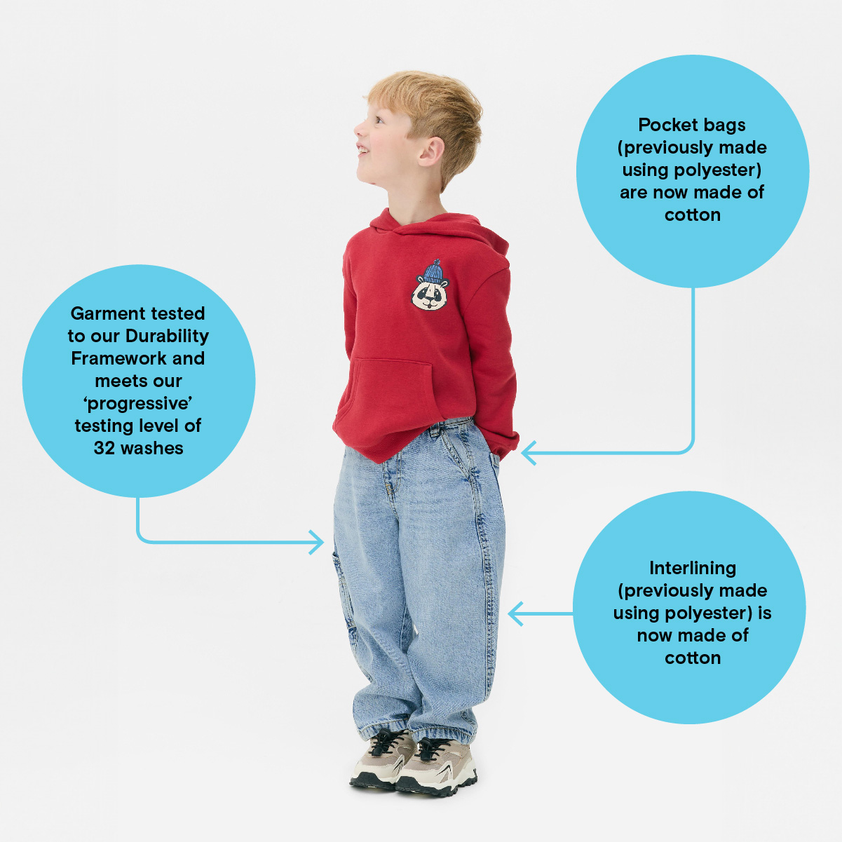 Our boyswear baggy fit jeans are now made from 100% cotton fabric sourced from the Primark Cotton Project. At the end of its life, the garment can be recycled once the polyester thread, care label and any functional trims have been removed at the point of recycling (which is done by a recycler as standard).